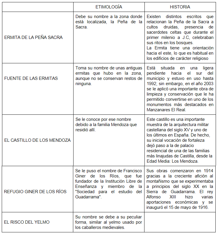 Sobre el nombre de Manzanares el Real hay varias especulaciones; la gran cantidad de Manzanos que había en esa zona, y el origen árabe de sus términos -"maza" (palacio) y -"nares" (río), nos llevaría a "Río palaciego".